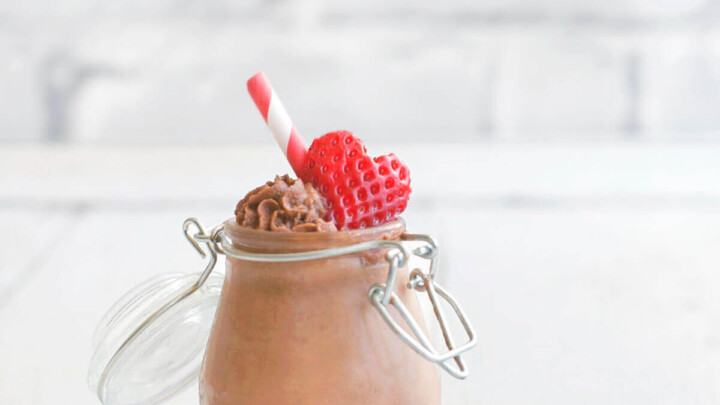 Pink milkshakes in tall glasses, strawberries and oreos on graham crackers, black and white strawsStrawberry White Chocolate Milkshake