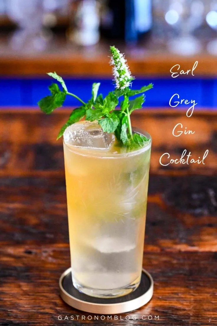 tan Earl Grey Gin Cocktail in tumbler with mint sprig garnish on wooden table