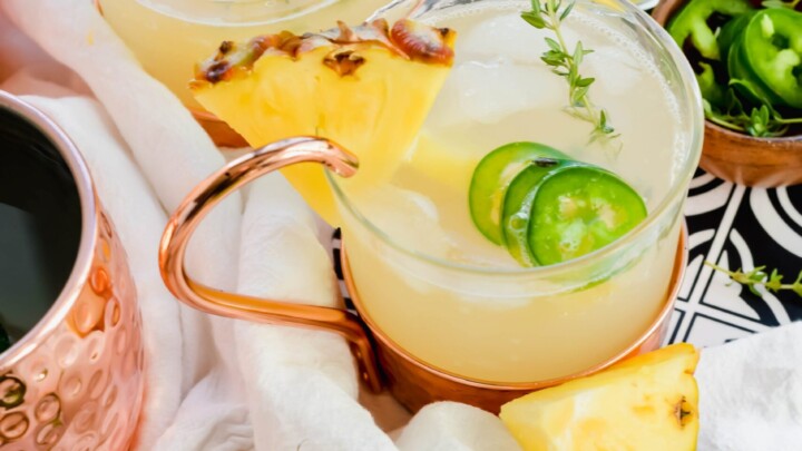 This tropical twist on the classic Moscow Mule is a perfect Summer Vodka Cocktail! Adding pineapple juice and spicy jalapeno pieces makes for a spicy sip with the ginger beer and lime juice!