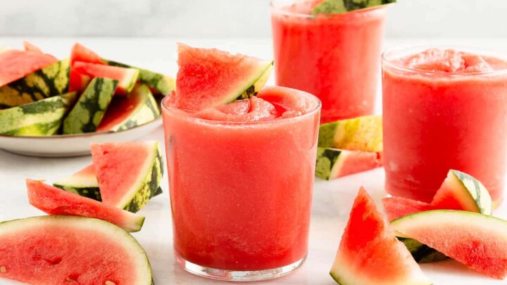 This simple frozen cocktail is full of fresh watermelon and lime flavors! Blended to perfection, this watermelon slush cocktail uses the vodka to perfection by highlighting the watermelon and lime flavors, perfect cold summer sip!