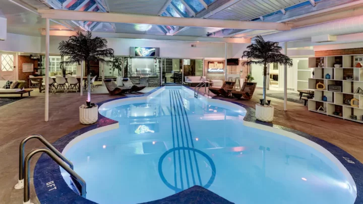This amazing retro house in Kansas City has an heated indoor swimming pool shaped like a guitar! This 6,000 square foot weekend getaway has 4 bedrooms and 4 bathrooms, plus 2 half bathrooms, too! Elvis actually stayed at this home while in Kansas City in the 1950s!