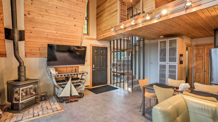 This Crofton Cabin has great views of the river, and a lot of room to spread out across all the floors of the A frame cabin by a spiral staircase. Near a state recreation area and golf couse, with nearby hiking trails.