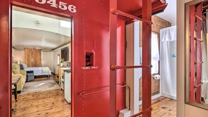 This unique vacation rental is in an old Santa Fe caboose! With a queen bed, kitchenette, and full bathroom just outside the caboose (but still inside!), this unique location is fun for train nuts and people that love interesting places to stay!